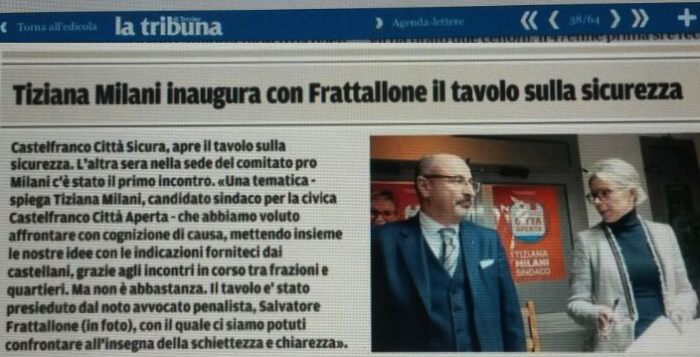 - ore 21.10: intervento dell’Avvocato Salvatore Frattallone, penalista, «Focus criminalità: l'analisi del fenomeno, i possibili rimedi. L'aumento record dei reati nella Marca; la tenuità del fatto come nuova causa di non punibilità; i nuovi poteri del Sindaco sulla sicurezza urbana e le Ordinanze contro la mendicità invasiva, l'accattonaggio molesto, lo spaccio, il danneggiamento e il degrado, lo sfruttamento della prostituzione; le ronde anticrimine e quelle 2.0 sui social; le convenzioni con la Vigilanza privata a tutela dei beni comunali e dei beni dei privati; la rete di videosorveglianza pubblico-privata per la smart-security; l'assicurazione contro i furti; la legittima difesa domestica e l'uso delle armi».